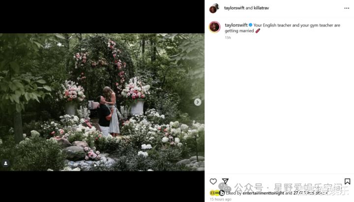 8月27日,流行歌星泰勒·斯威夫特(Taylor Swift)在个人Ins上发布了男友NFL球星特拉维斯·凯尔斯(Travis Kelce)单膝下跪的求婚照片,并配文:“你的英语老师和你的体育老师要结婚了。”正式官宣两人订婚。